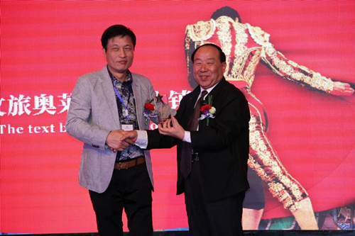 中国奥莱协会秘书长陆勇为西班牙风情小镇颁发“2017年最受期待的奥特莱斯”奖杯